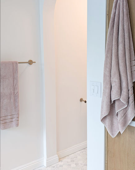 Tailoring the layout to her lifestyle, we achieved a thoughtful balance between coastal and zen elements through careful and thoughtful material selections and spatial planning. Key features include a double vanity with integrated seamless systems, increased counter space and LED-framed mirrors. We also designed a custom storage cabinet with an integrated hamper, a standalone tub with a recessed niche, an enlarged shower with bench seating and built-in niches, and a more spacious water closet. All this was accomplished while keeping the major plumbing lines intact, proving that beauty and functionality can coexist effortlessly.